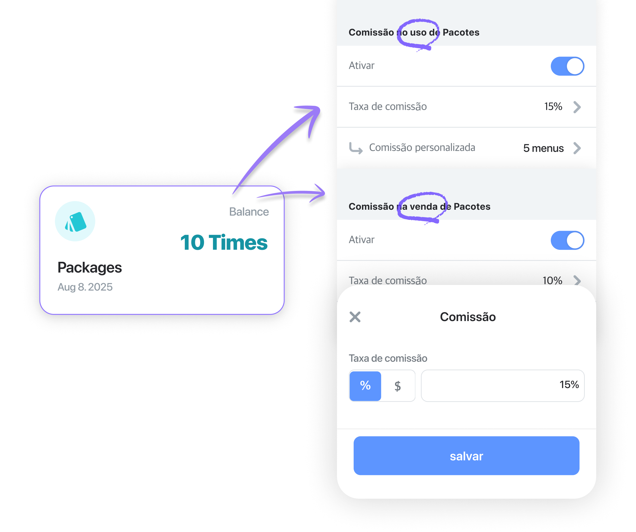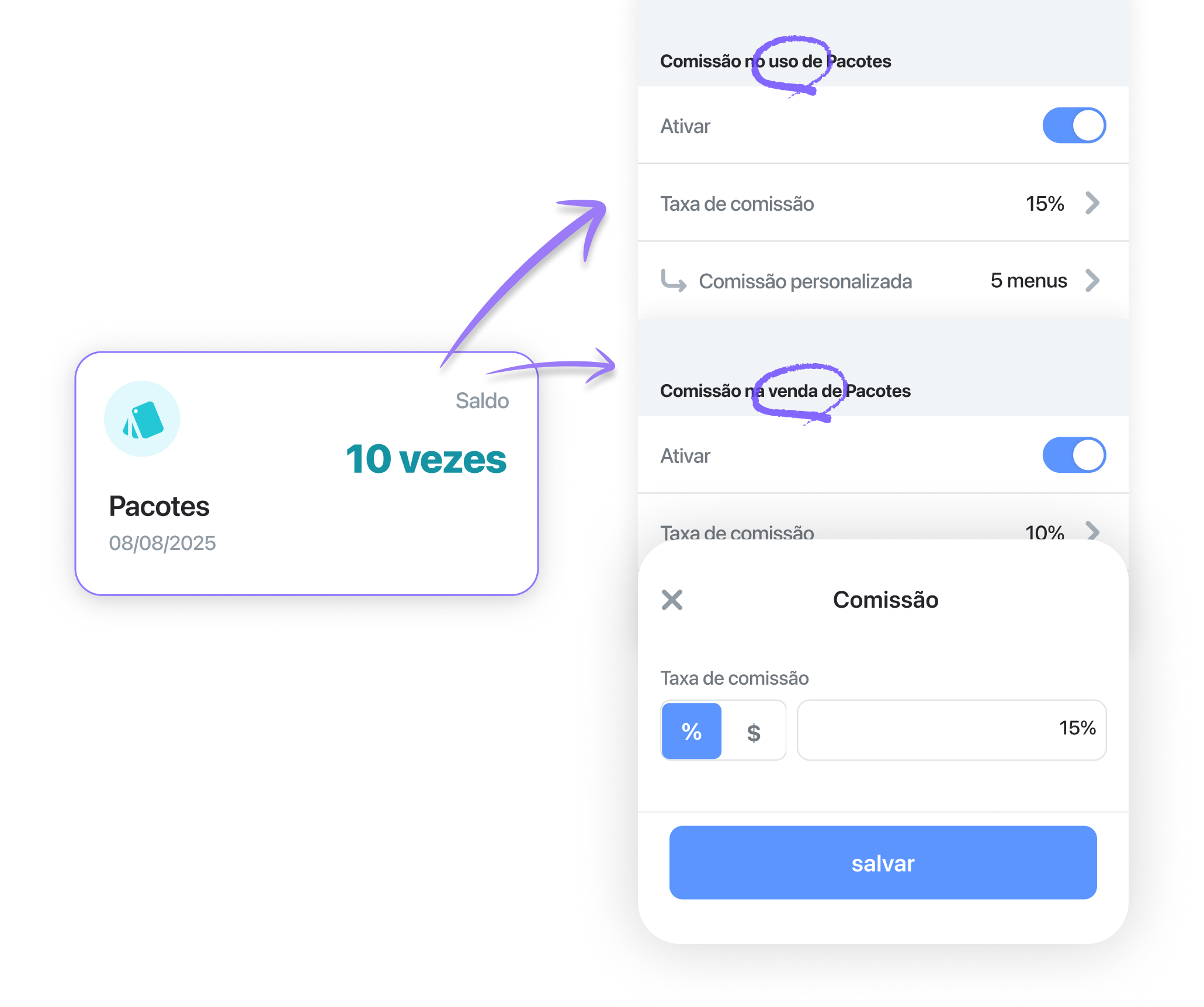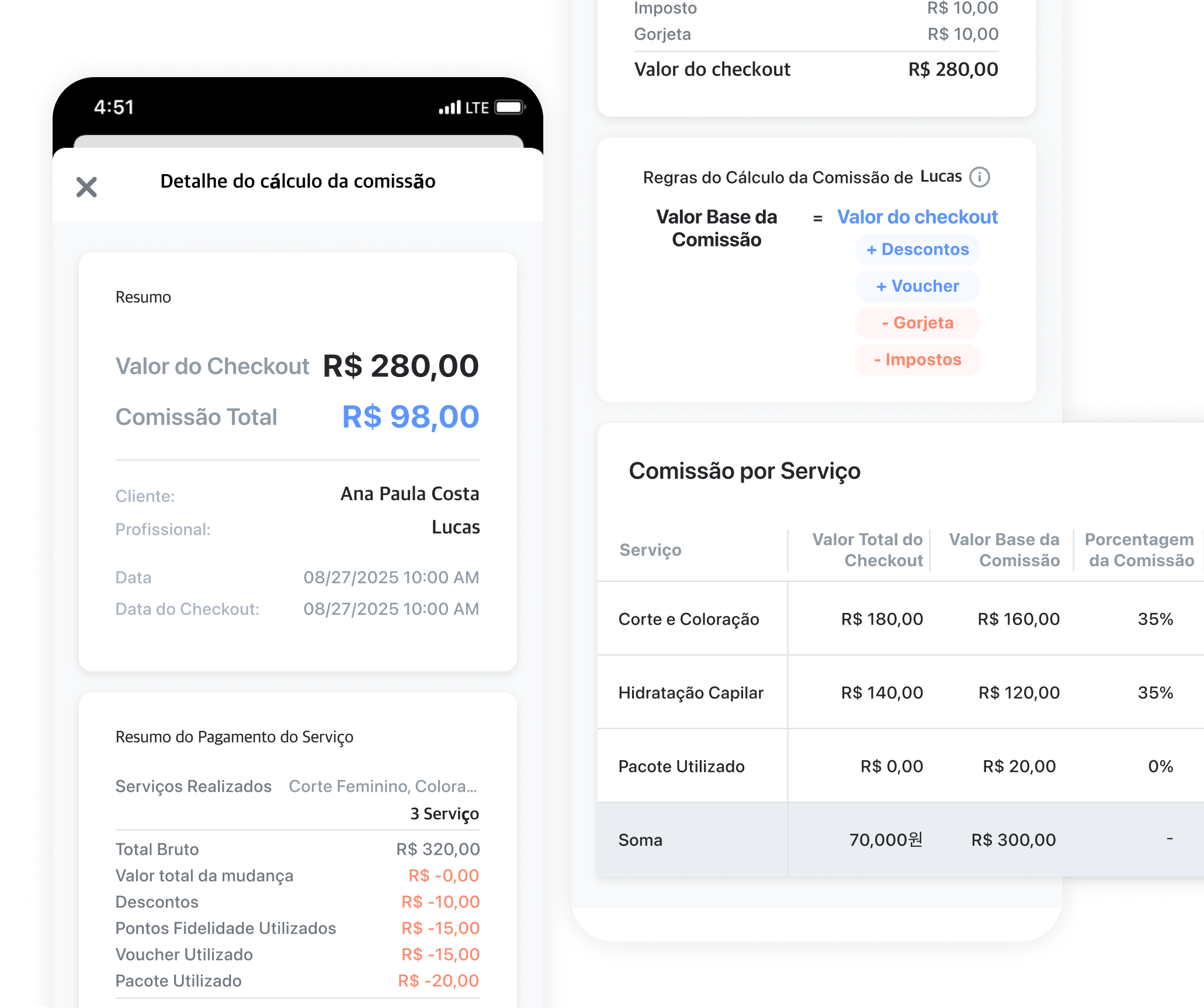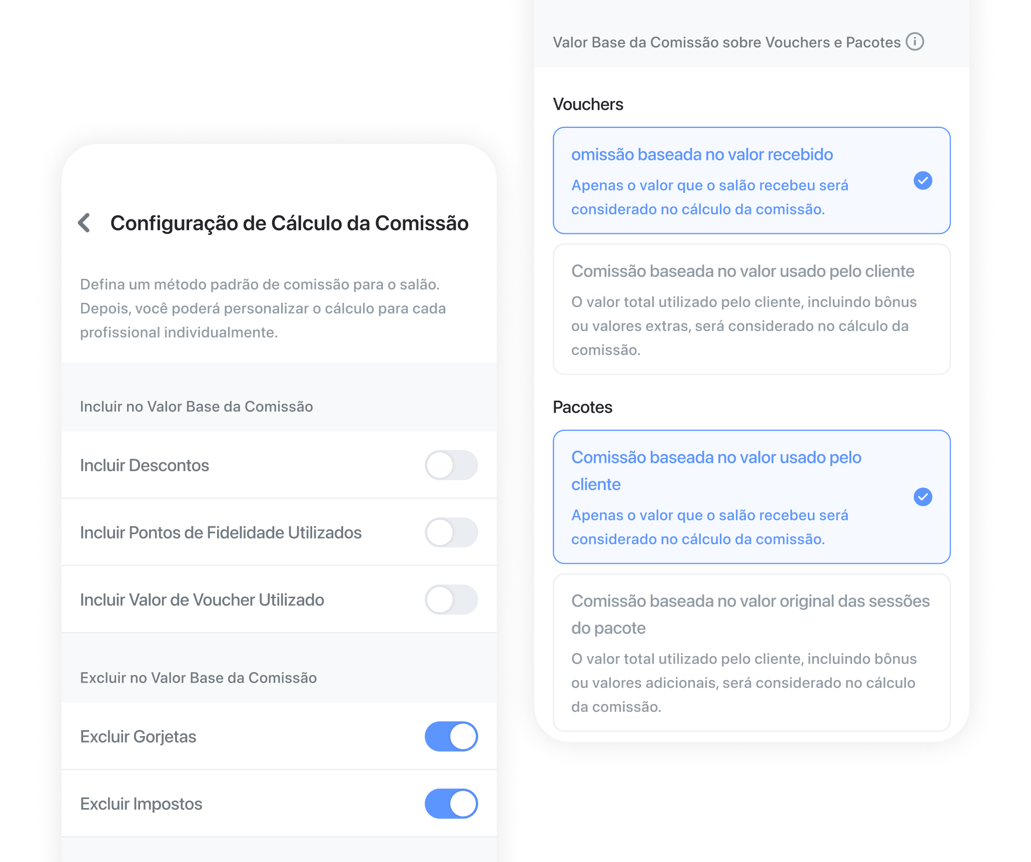 Você decide o que entra no cálculo da comissão: descontos, gorjetas, vouchers, pacotes, pontos de fidelidade e mais.