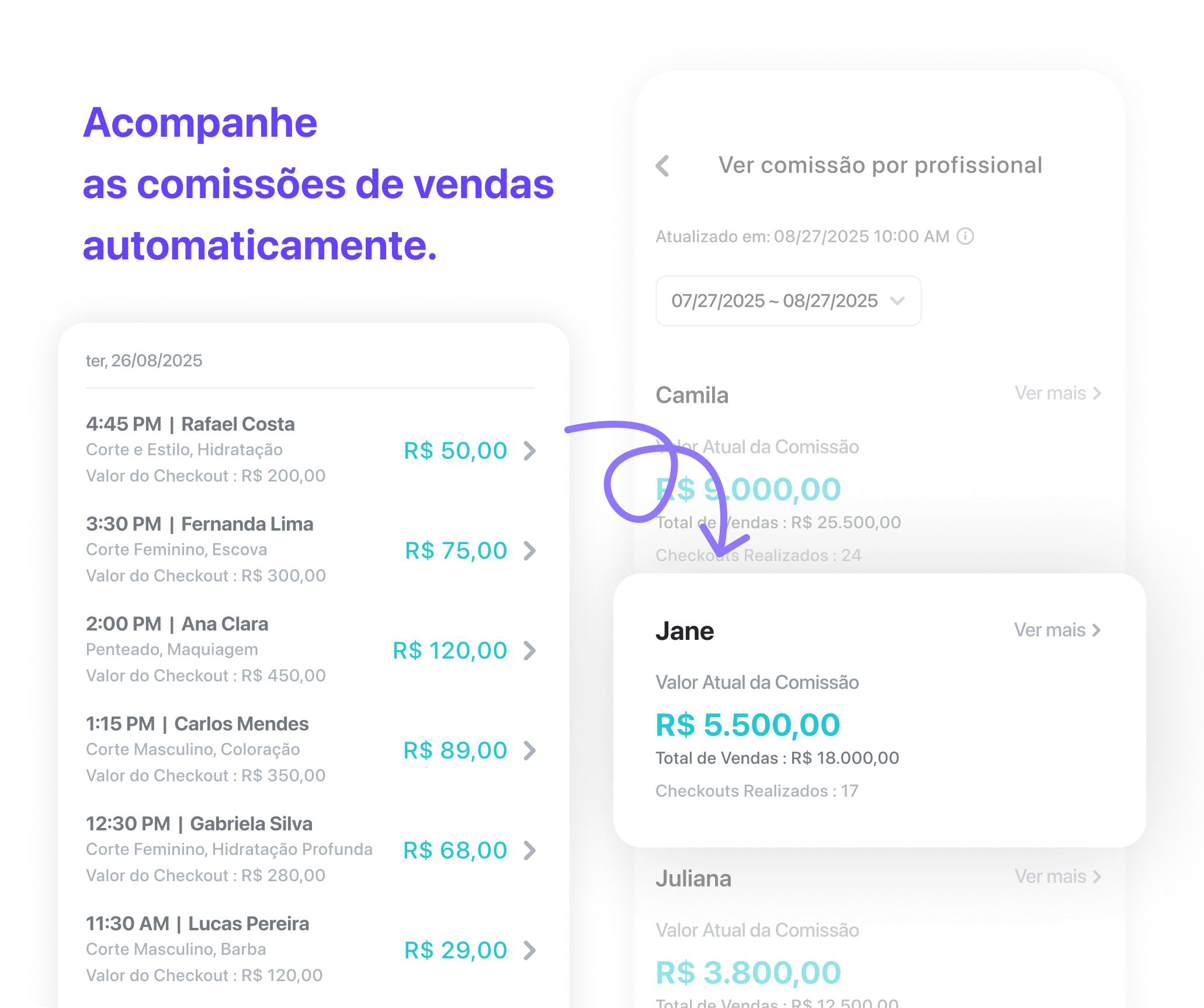 Diga adeus aos cadernos e planilhas. As comissões são calculadas automaticamente no momento da venda, por serviço, produto, data e profissional.