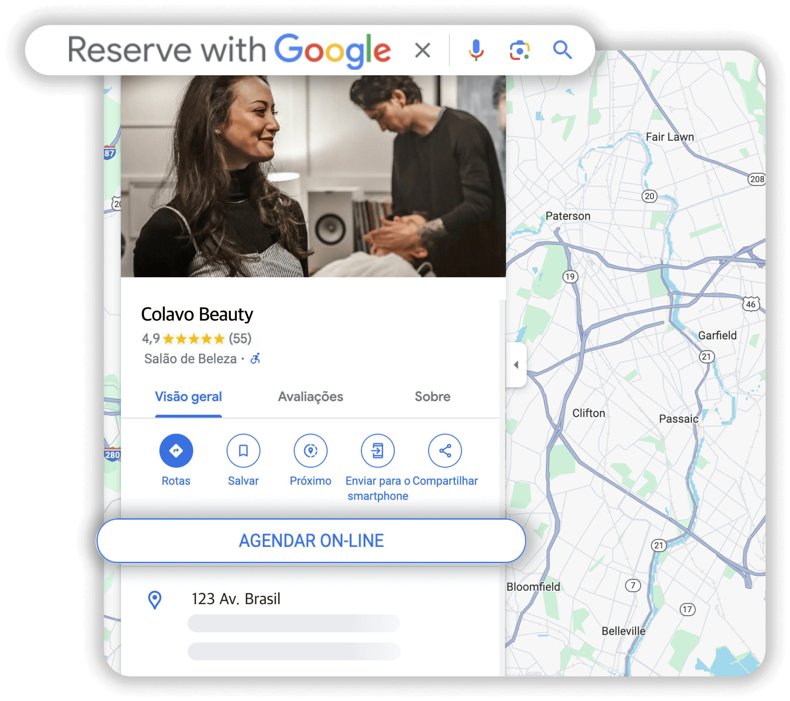 A integração com seu perfil comercial do Google simplifica o processo de reserva para seus clientes em várias plataformas do Google, como Pesquisa, Mapas e Assistente.