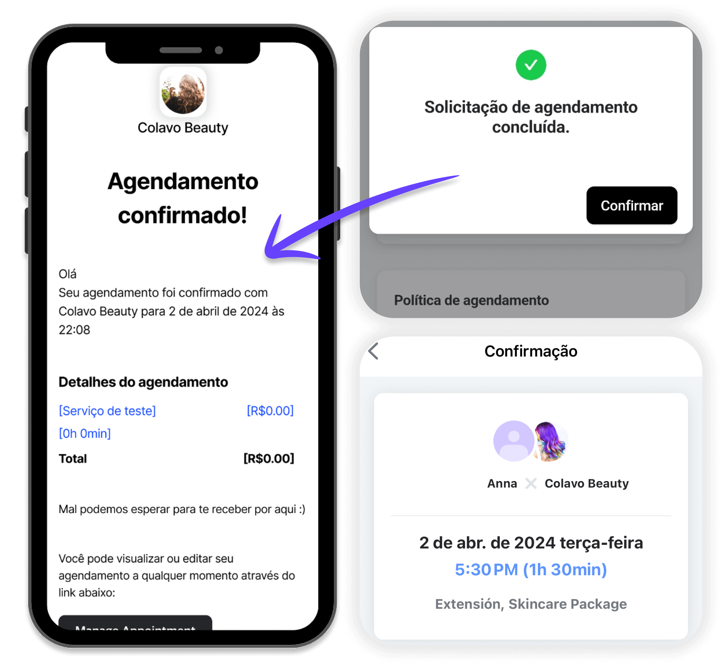Este recurso mantém seus clientes informados sobre seus próximos agendamentos, não importa onde estejam, melhorando sua experiência de agendamento no geral.