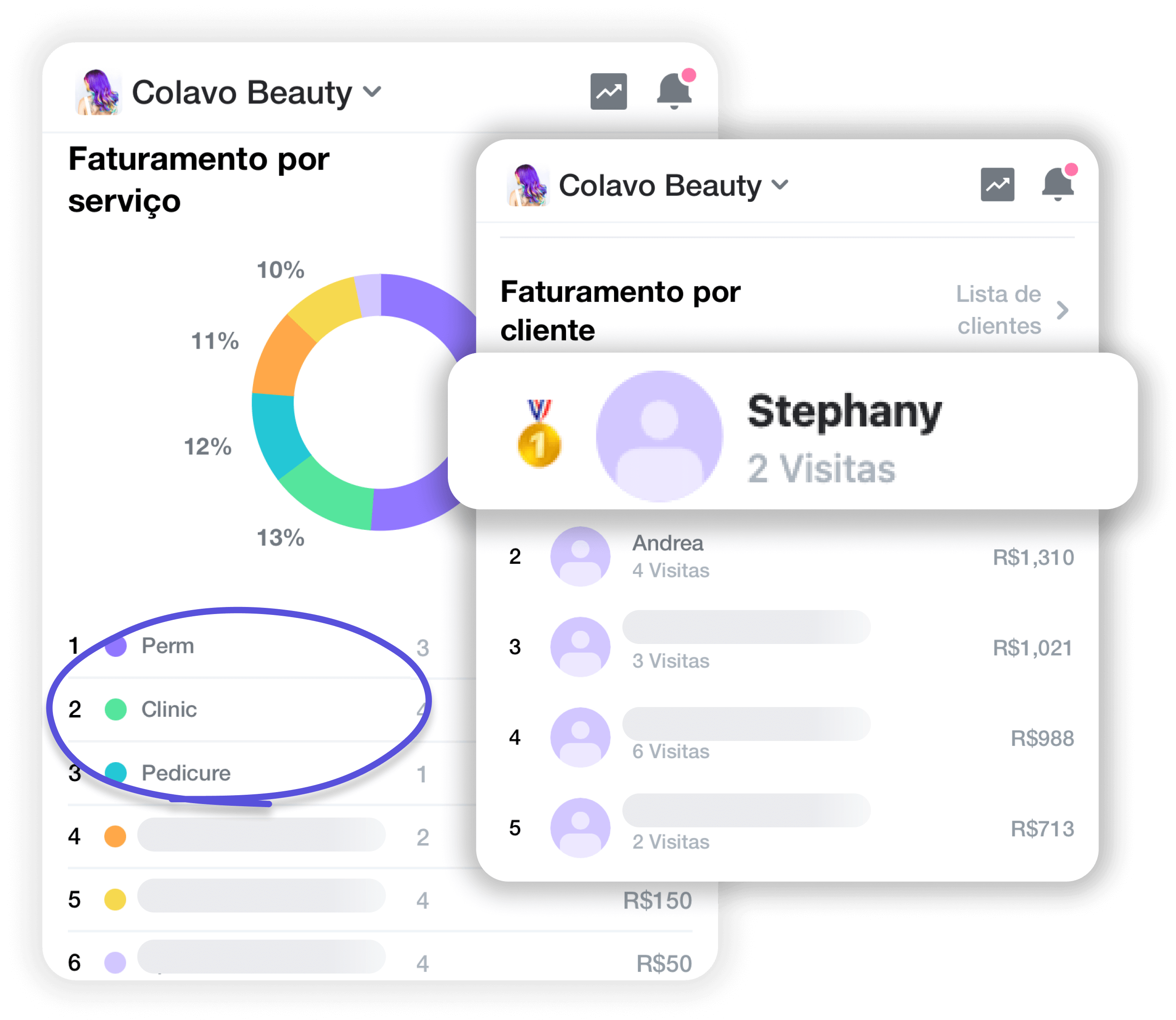 Obtenha uma visão clara e abrangente do desempenho do seu salão com 7 relatórios diferentes. Caso você queira ver agendamentos por canal, receita por serviço, rankings e receitas de clientes e profissionais - nós disponibilizamos para você.