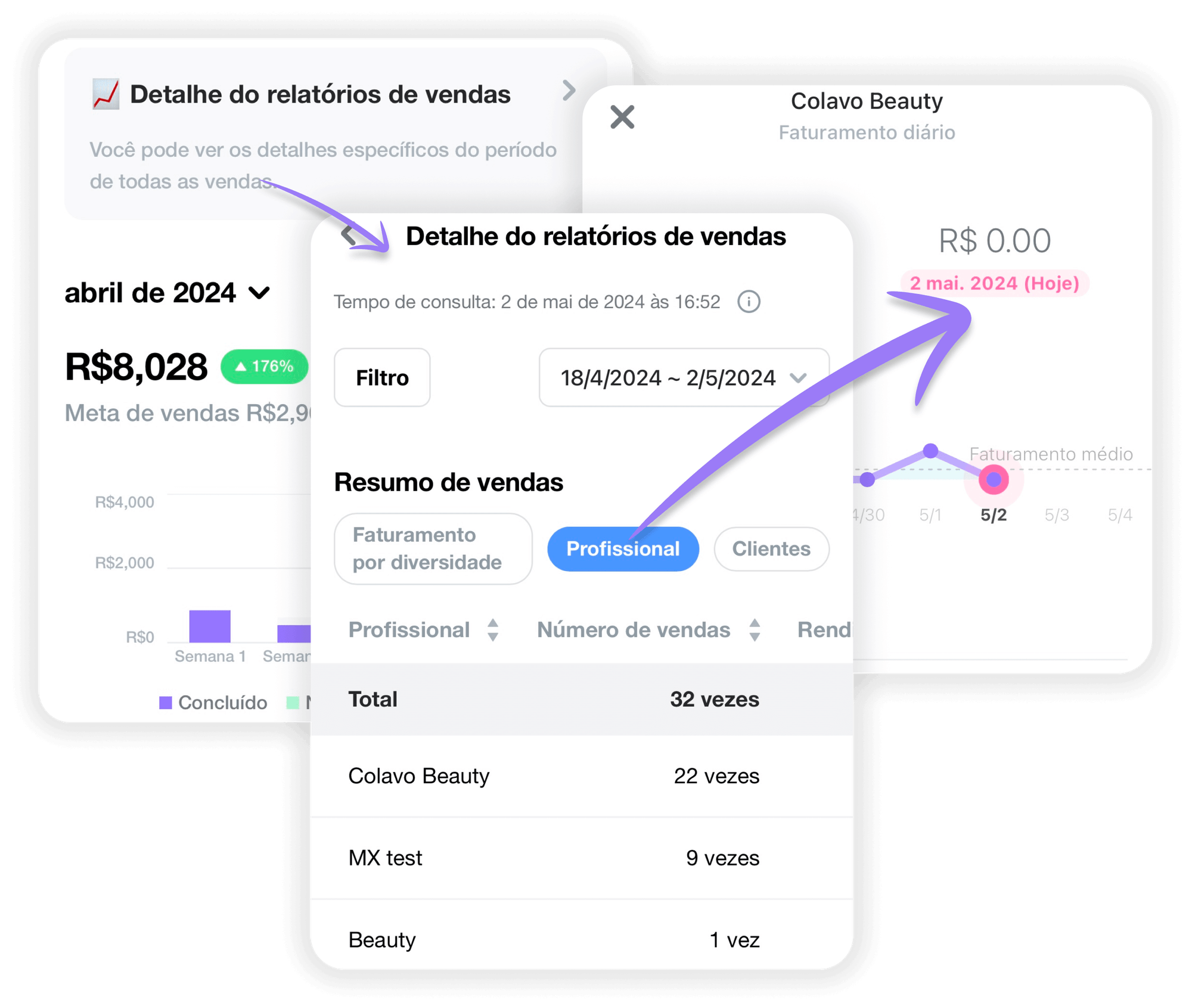 Todas as informações de vendas do salão e de cada profissional estão estruturadas em uma linha do tempo fácil de ler. Esta visão clara permite um entendimento e análise das vendas e receitas de uma forma simples e eficaz. Além disso, há visualizações diárias e mensais para análise sobre a média de vendas.