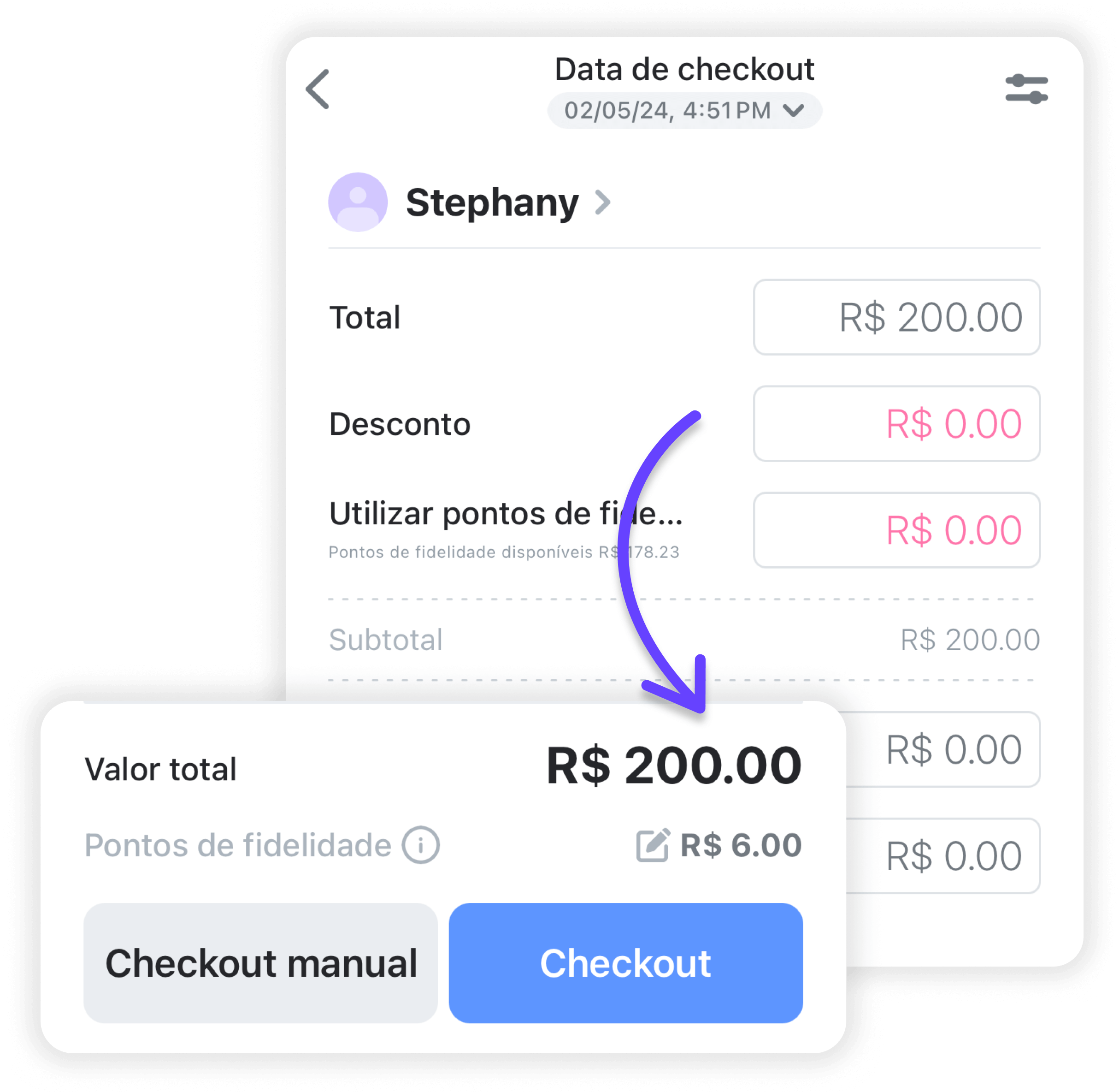 O recurso de checkout é muito intuitivo. Com sincronização automática de dados, completar um checkout requer apenas alguns toques. Além disso, cada item pode ser editado manualmente, permitindo uma experiência de checkout personalizada para cada agendamento.