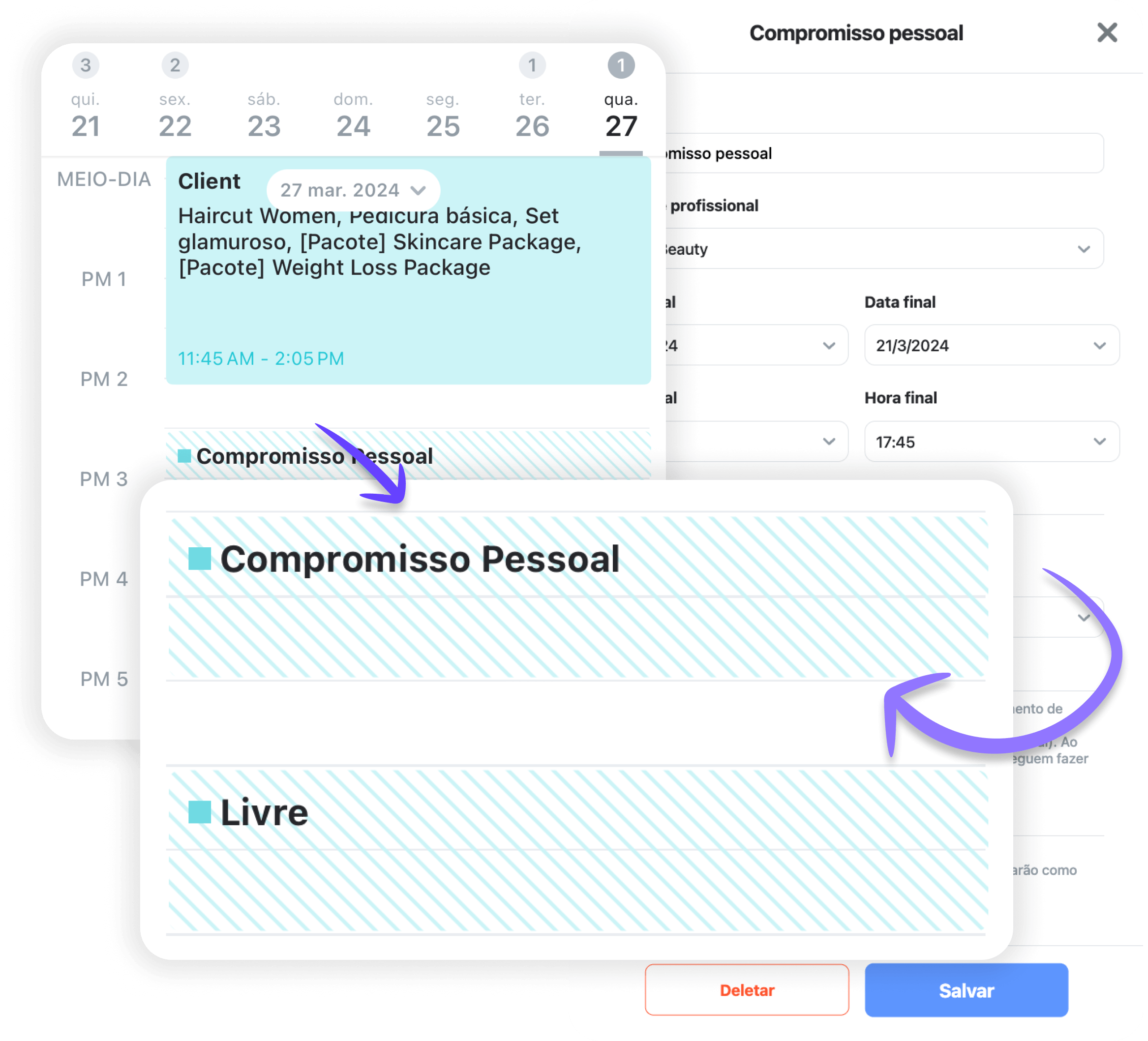 Cada serviço é único, e o tempo que você precisa entre eles também. Seja para organizar o espaço após um corte e coloração ou apenas para ter um momento para descansar. Você pode definir o tempo de intervalo entre os serviços, assim, após cada serviço, você tem tempo para estar pronto para o próximo.